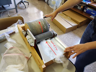 ともかく、羊の毛を少しずつ小分けに、ドラムカーダーのとても硬くて太いブラシのついた大小二本のローラーの間を通すと、毛がほぐれ、綿菓子みたいな感じで、ローラーのブラシにくっついて出てきます。
